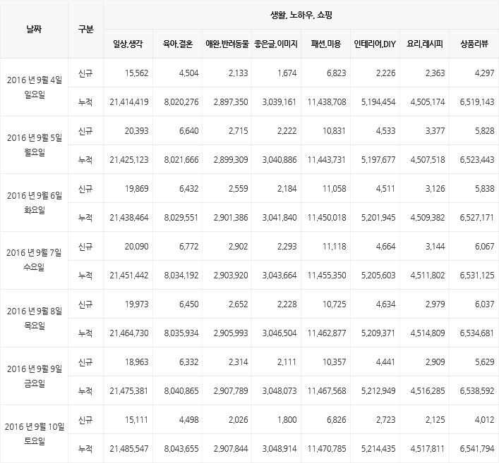'생활·노하우·쇼핑'은 다른 매체 대비 블로그에 대한 검색 이용자 요구와 만족도가 높은 분야인데요, 그만큼 블로그 문서 생산량도 다른 분야에 비해 월등하게 많습니다. 특히 일기 형식으로 운영하는 개인 블로그가 많다 보니 '일상·생각' 주제로 생산되는 블로그 문서는 하루 약 2만 개에 이르고, 누적으로는 2천만 개가 넘습니다.