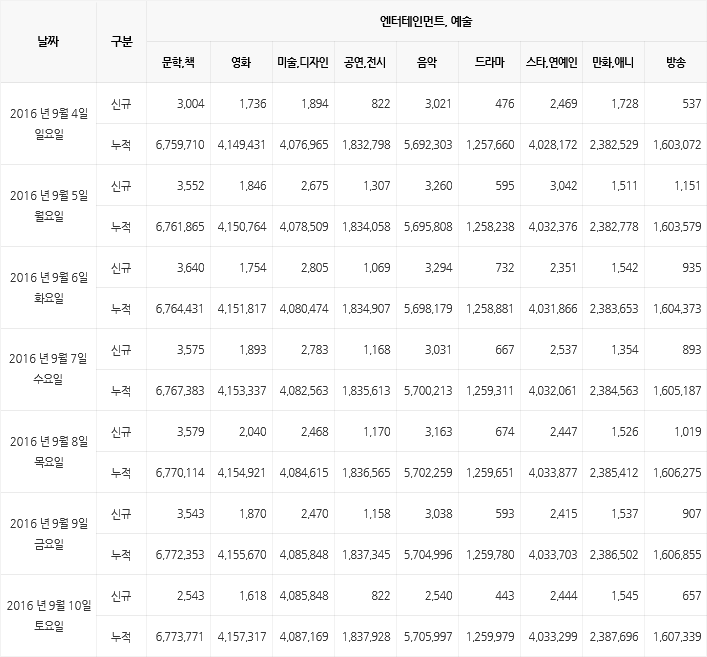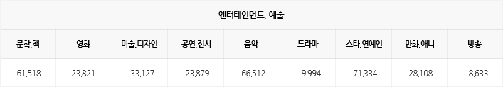 '엔터테인먼트·예술' 분야의 주제 중 일간 문서 생산량이 가장 많은 주제는 '문학·책'입니다. 하루 약 3,500개의 블로그 문서가 검색 결과에 신규로 반영되고 있으며, 누적량은 6백70만 개입니다. 그리고 '음악'과 '스타·연예인'이 비슷한 규모로 바로 뒤를 잇고 있습니다.