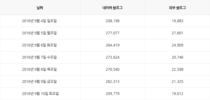 위의 표에서 보시는 것과 같이 검색 결과에 새롭게 추가되는 블로그 문서는 하루에 약 30만 건입니다. 비율로 따지면 네이버 블로그가 9, 외부 블로그가 1로 네이버 블로그에서 생산되는 신규 문서가 월등히 많다는 것을 알 수 있는데요, 네이버 블로그에서 생산되는 문서의 수가 외부 블로그를 크게 앞서다 보니 실제 검색 결과에서 네이버 블로그가 노출되는 빈도도 자연스럽게 높아져 간혹 네이버 검색이 네이버 블로그를 더 우대하는 것처럼 느껴지기도 합니다.