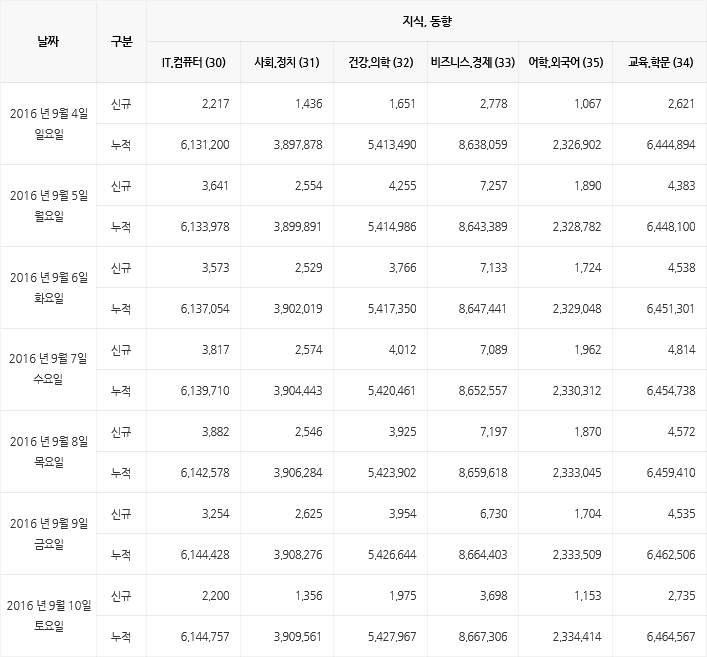 '지식·동향' 분야는 각 주제별 전문가가 많이 활동하는 분야로, 다른 분야와 비교했을 때 위 표에서 보시는 것과 같이 주말과 평일의 포스팅 수가 크게 차이 나는 것이 특징이라고 할 수 있습니다. 이는 기업 및 기관, 단체에서 운영하는 블로그의 포스팅이 많기 때문이라고 파악하고 있습니다.